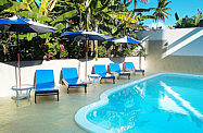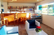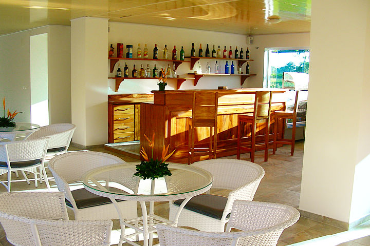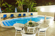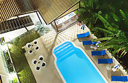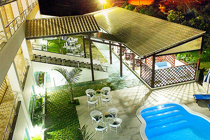 A convidativa piscina com capacidade para 60.000 litros, medindo 10m comprimento por 4,5m largura e 1,40m de profundidade, possui uma bela cascata, iluminação led (noturna), hidromassagem e deck em porcelanato. A área da piscina soma-se ao acolhedor e relaxante ambiente tropical (ao lado da área verde) com espreguiçadeiras confortáveis com colchonete, sombreiros e mesa de centro. Para maior comodidade dos hóspedes a pousada oferece serviço de bar à beira da piscina (drinks, bebidas, sanduíches e petiscos).